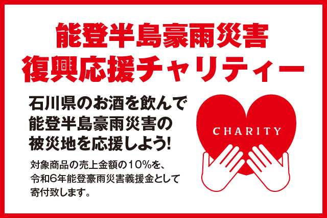 リカーマウンテンの全店舗 及び 通販サイトにて、期間中に販売された石川県のお酒の売上金額の10%を、令和6年能登豪雨災害義援金として寄付いたします。石川県のお酒を飲んで被災地を応援しよう!